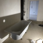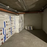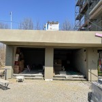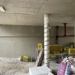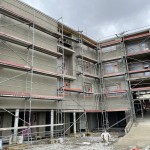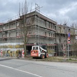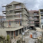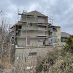 Máme hotové kompletní vnitřní rozvody všech médií – voda, odpady, NN, topení, MaR, VZT. V domě jsou již v každém bytě instalovány kotle pro vytápění i ohřev TUV. Anhydridové podlahy jsou provedeny v celém objektu. Jsou kompletně dokončeny vnitřní omítky, budova má zateplenou fasádu včetně osazení všech vnějších výplní otvorů a čeká nás poslední úkon – finální barevná fasáda. Tu předpokládáme dokončit do konce dubna. Poté se zbavíme lešení kolem objektu. Střecha je hotová vč. prostupů instalačních šachet. Uvnitř domu nyní probíhají přípravné práce – osazení roštů pro montáž SDK podhledů, montáž protipožárních prostupů instalací, pokládka skladby podlah venkovních pavlačí. Ve dvoře je již položena základní štěrková vrstva pro pojízdné zpevněné plochy.