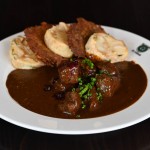 • Jelení guláš s červeným vínem, karlovarským knedlíkem a bramboráčky