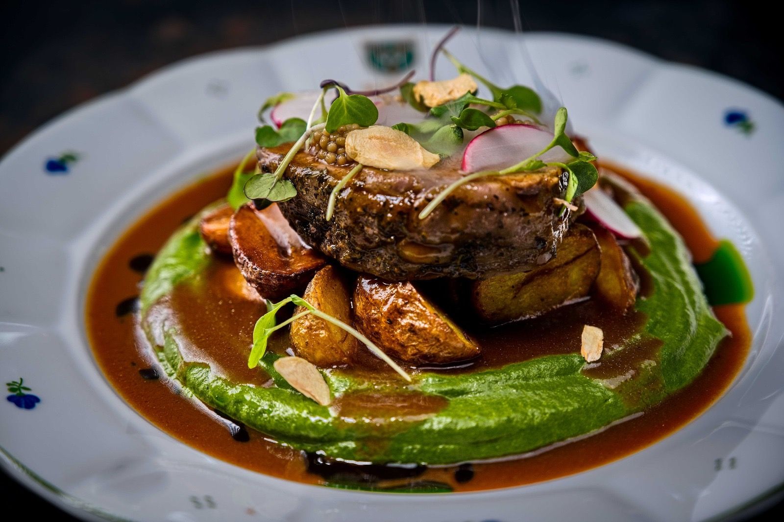 • Jehněčí plec na bylinkách a česneku se špenátovým pyré, smaženými grenaille a olejem z medvědího česneku