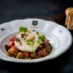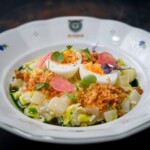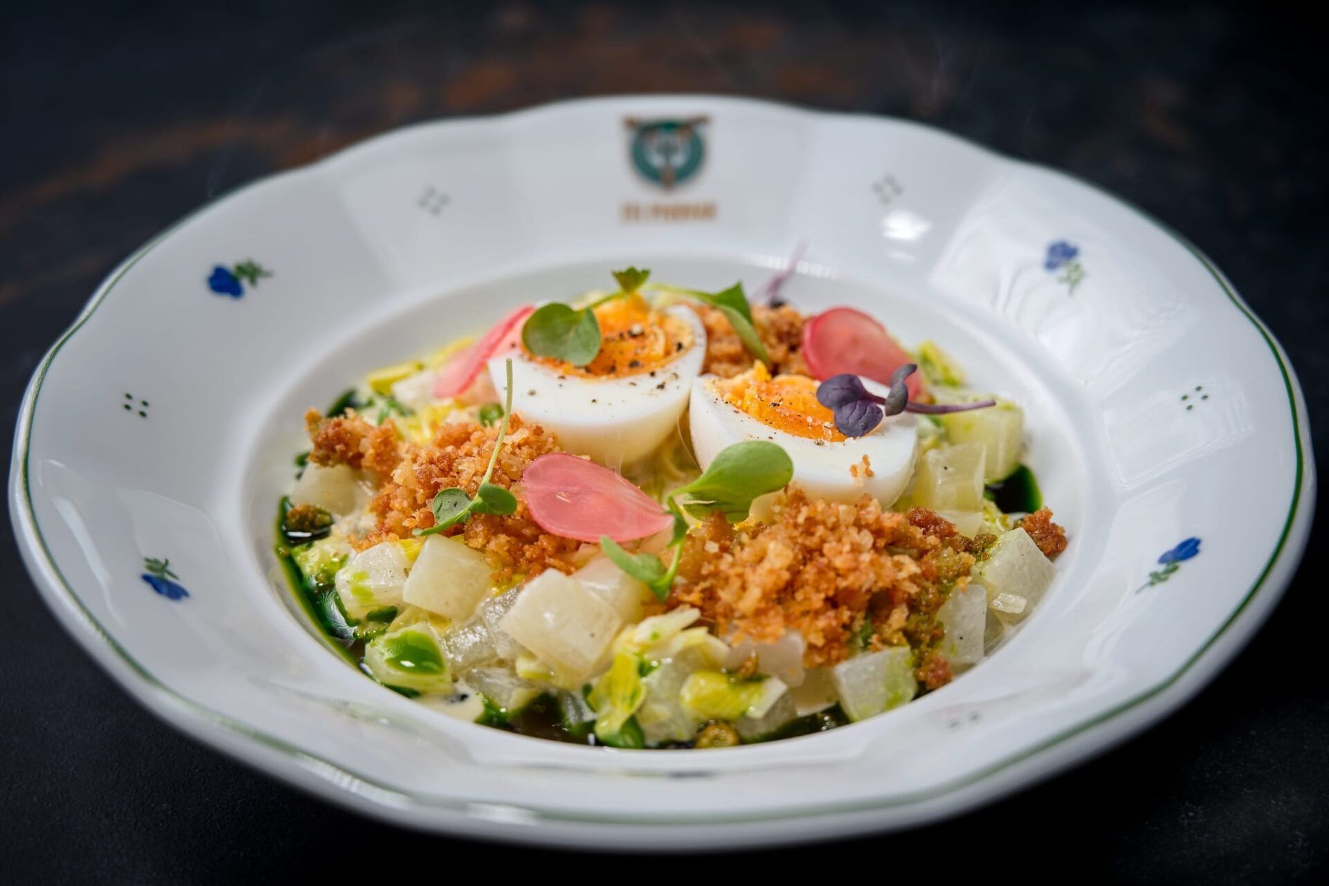 • Kedlubnovo-pórkové ragú s hráškem s vařeným vejcem, Gran Moravia crumble a olejem z medvědího česneku