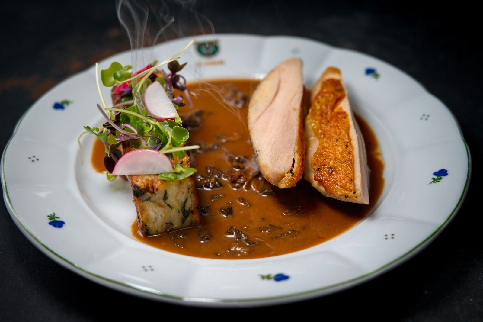 • Kuřecí kukuřičné prso sous-vide s jarní nádivkou a smržovou omáčkou
