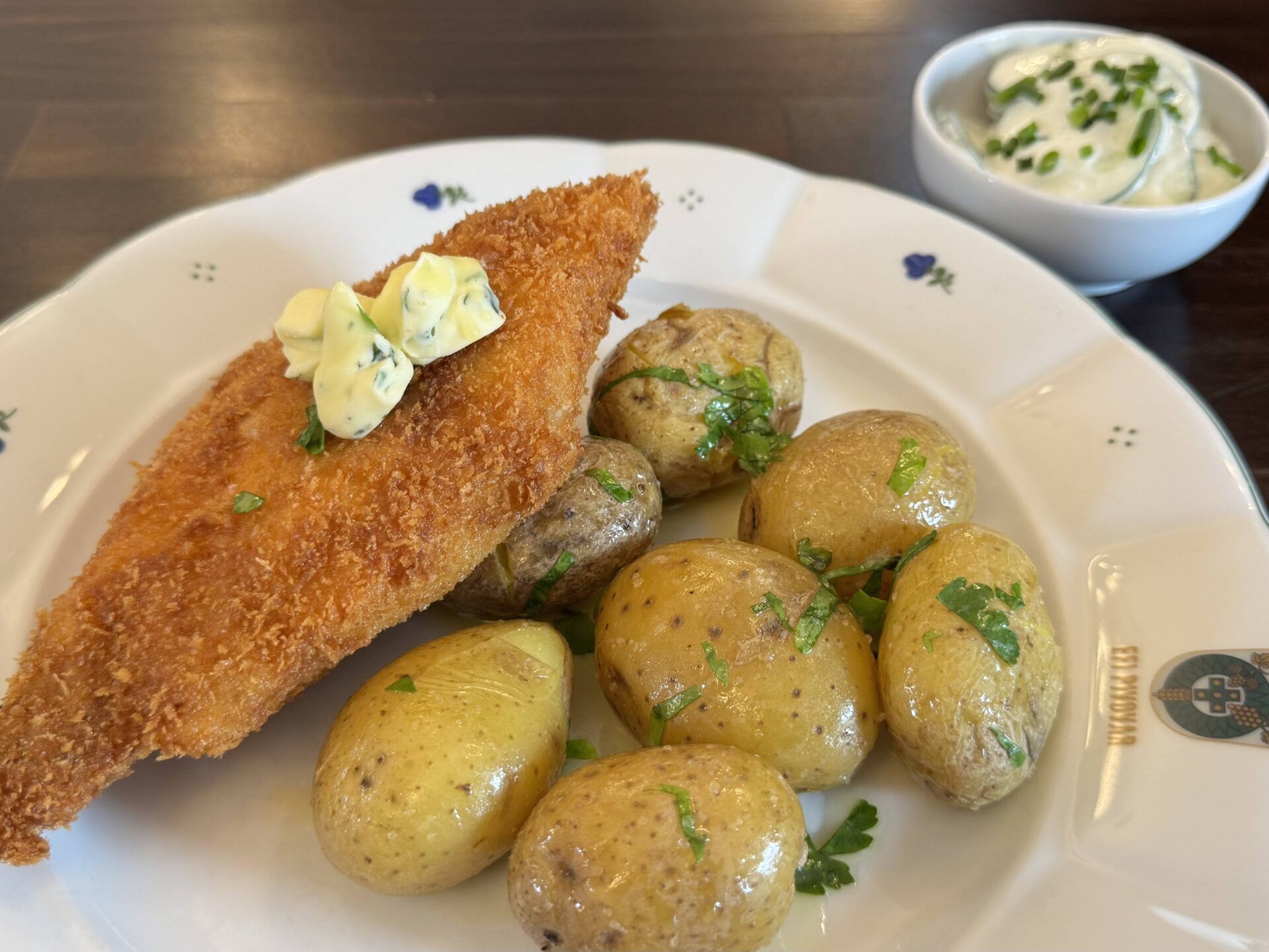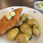 • Kuřecí supreme v křupavé strouhance s bylinkovým máslem, jarními bramborami s petrželkou a okurkovým salátem se smetanou
