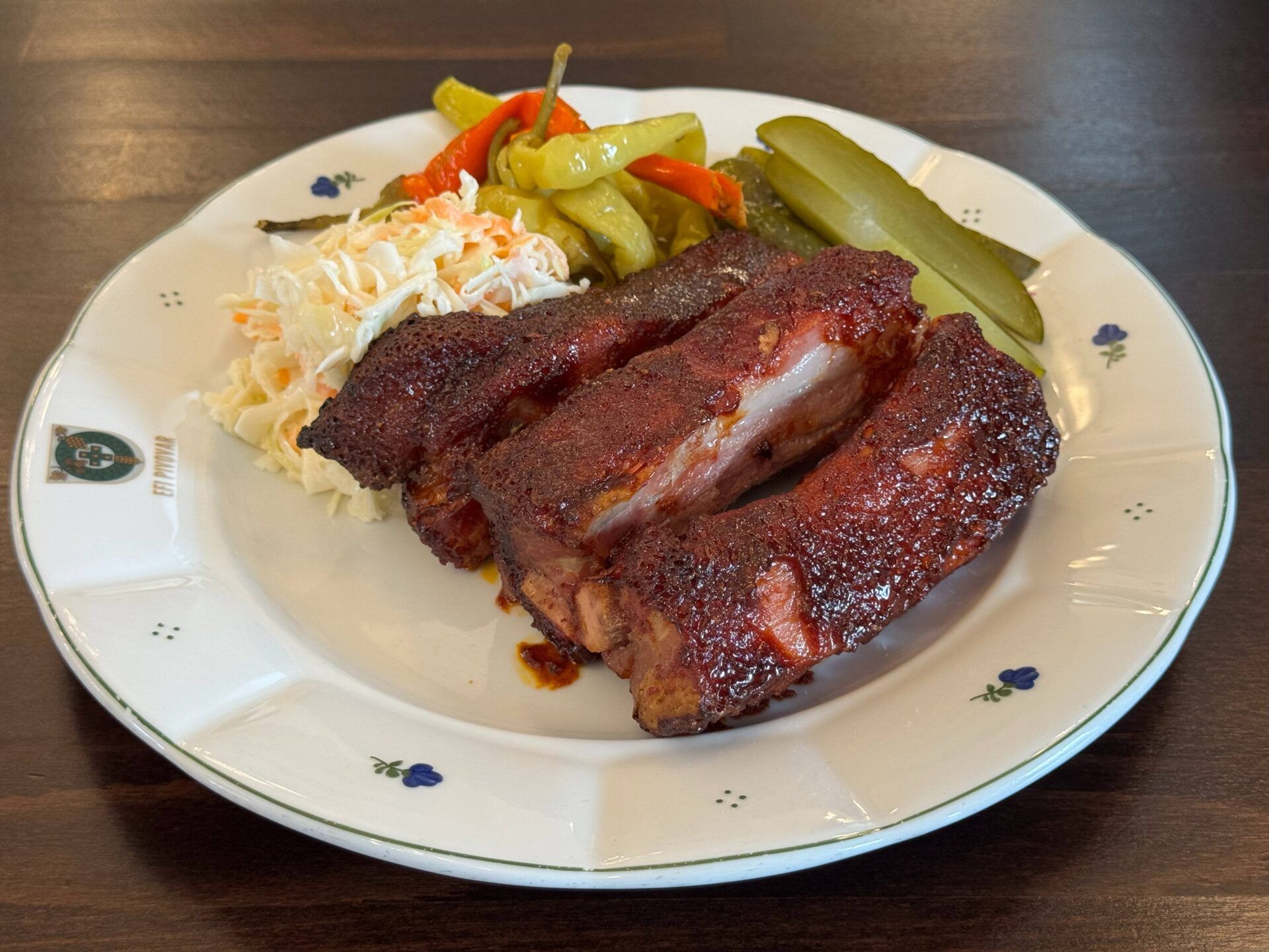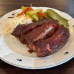 • Pečená vepřová žebra v naší marinádě s kyselými okurkami, salátem coleslaw a rozpečeným chlebem