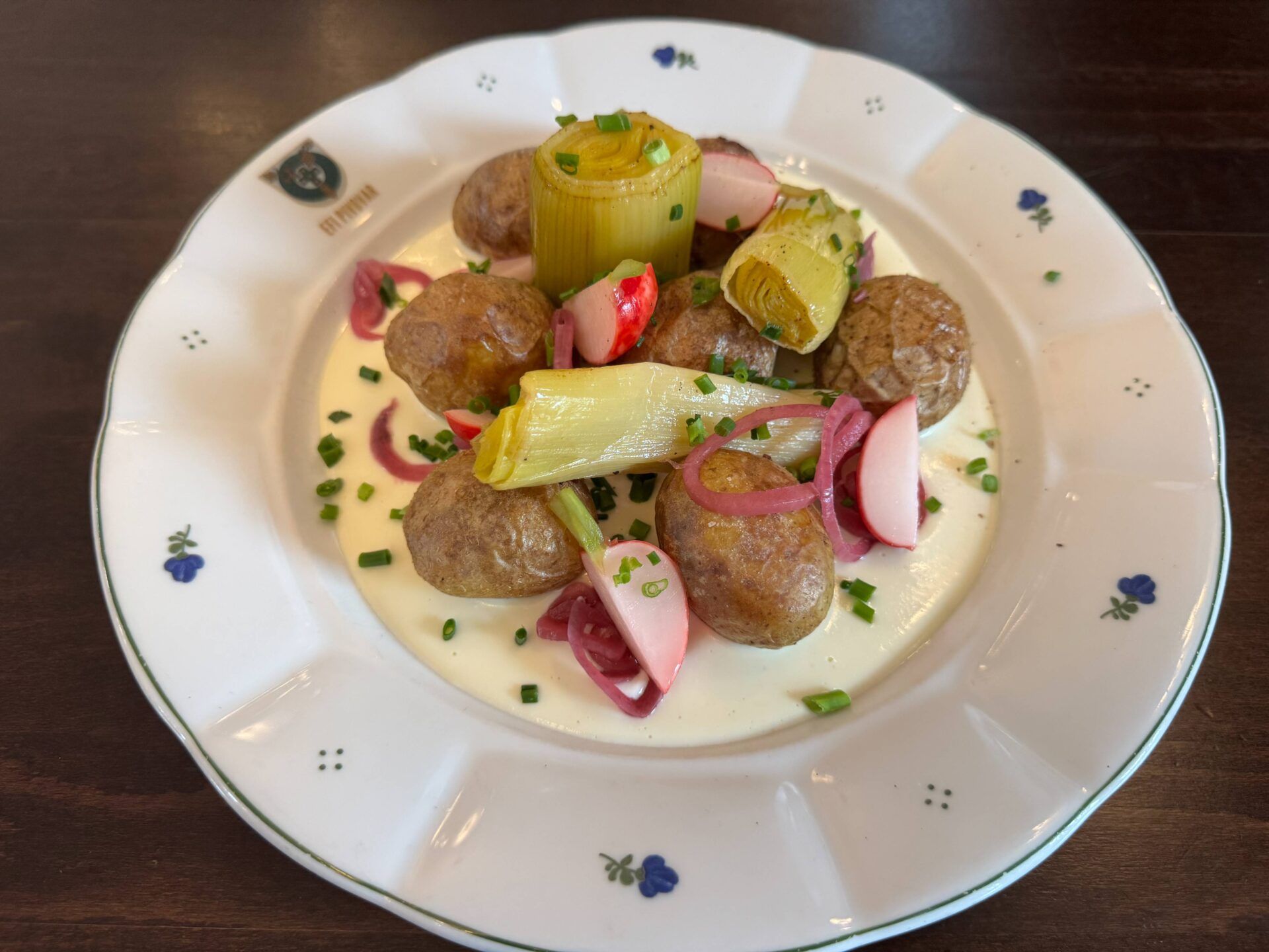 • Pečené jarní brambory s brynzovým krémem s konfitovaným pórkem a ředkvičkami