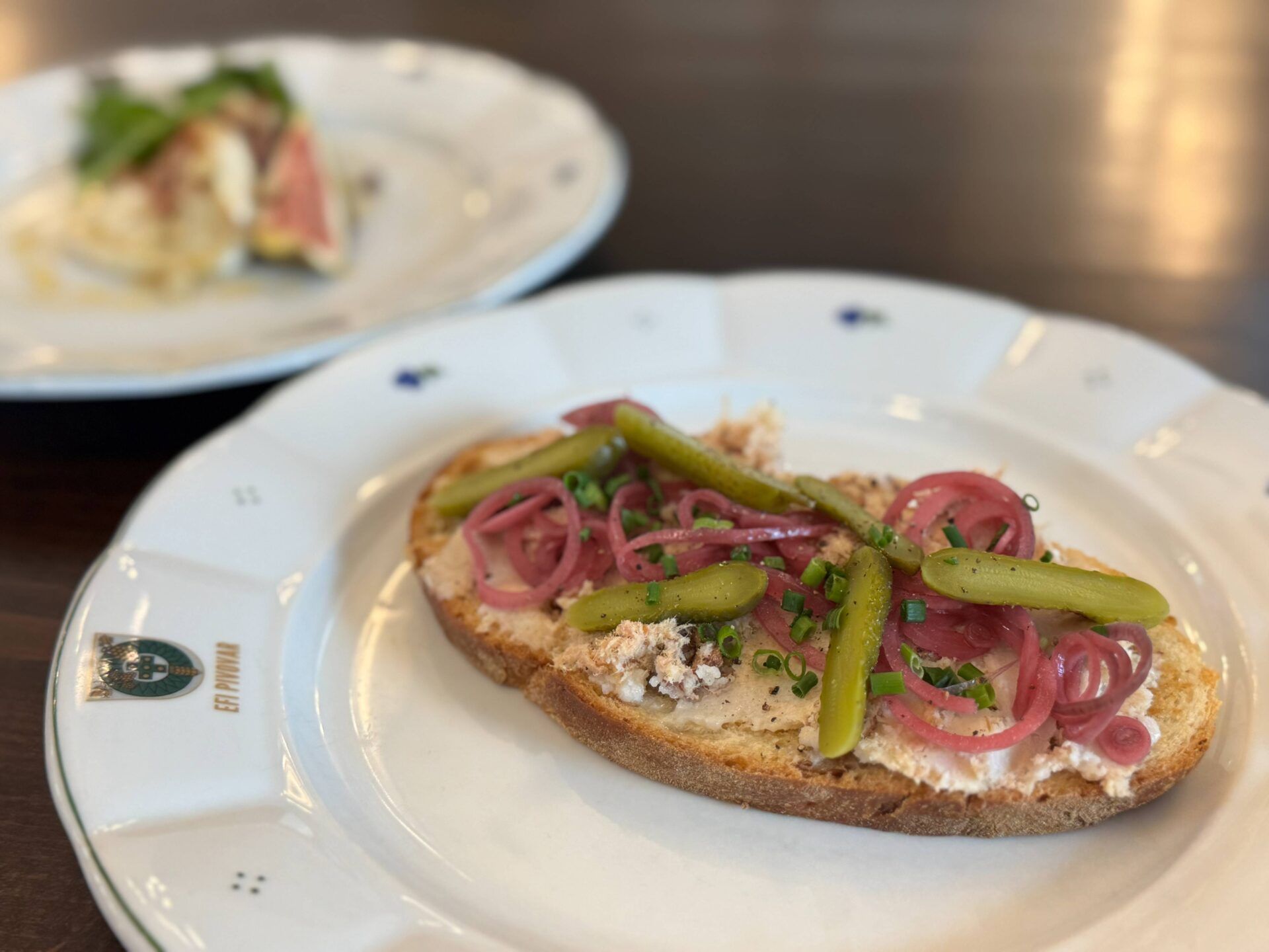 • Rilletes z vepřového boku na rozpečeném chlebu s nakládanou cibulí a kyselými okurkami