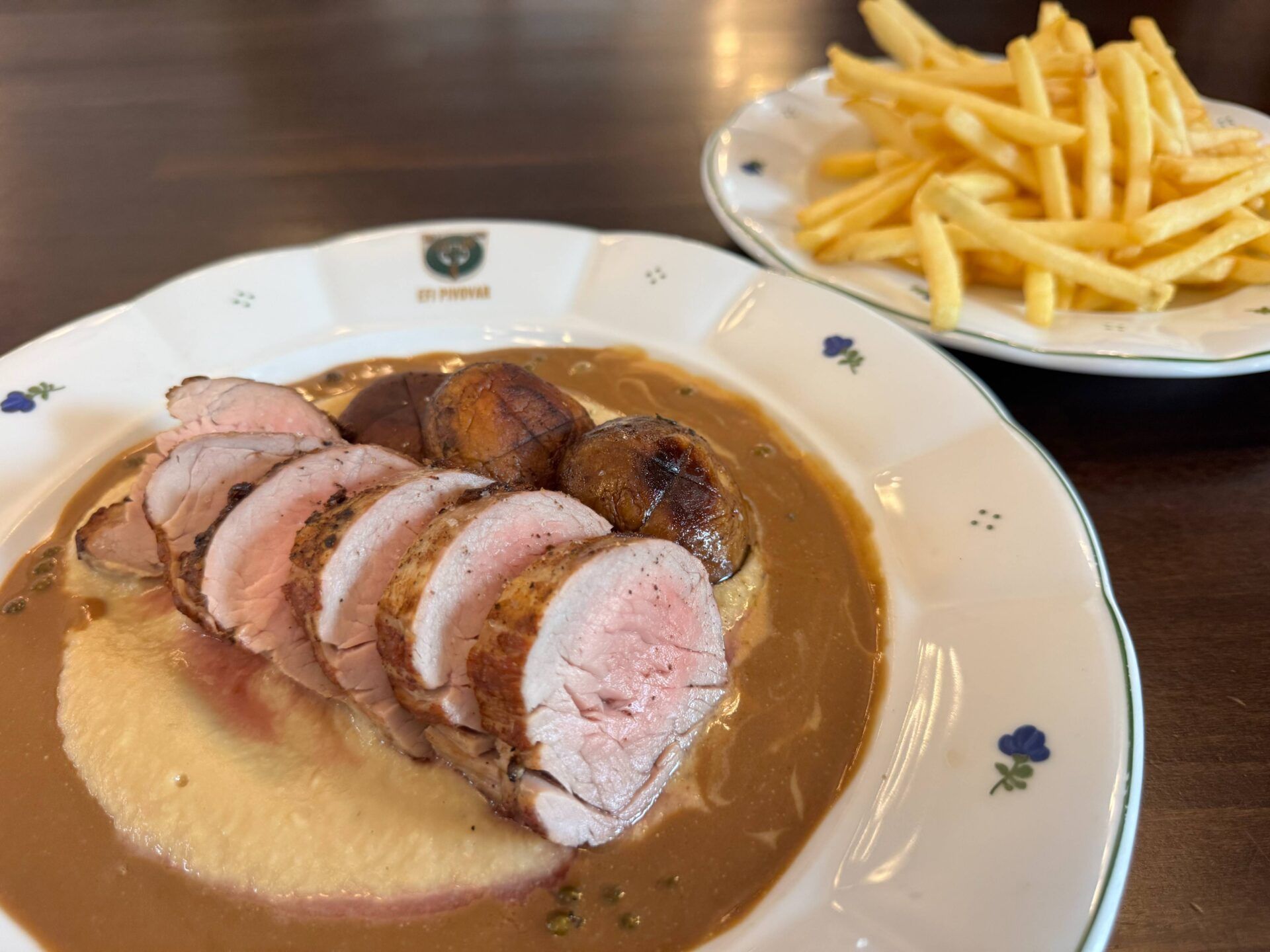 • Vepřová panenka s pyré z pečených cibulí, grilovanými hnědými žampiony, pepřovou omáčkou a hranolkami