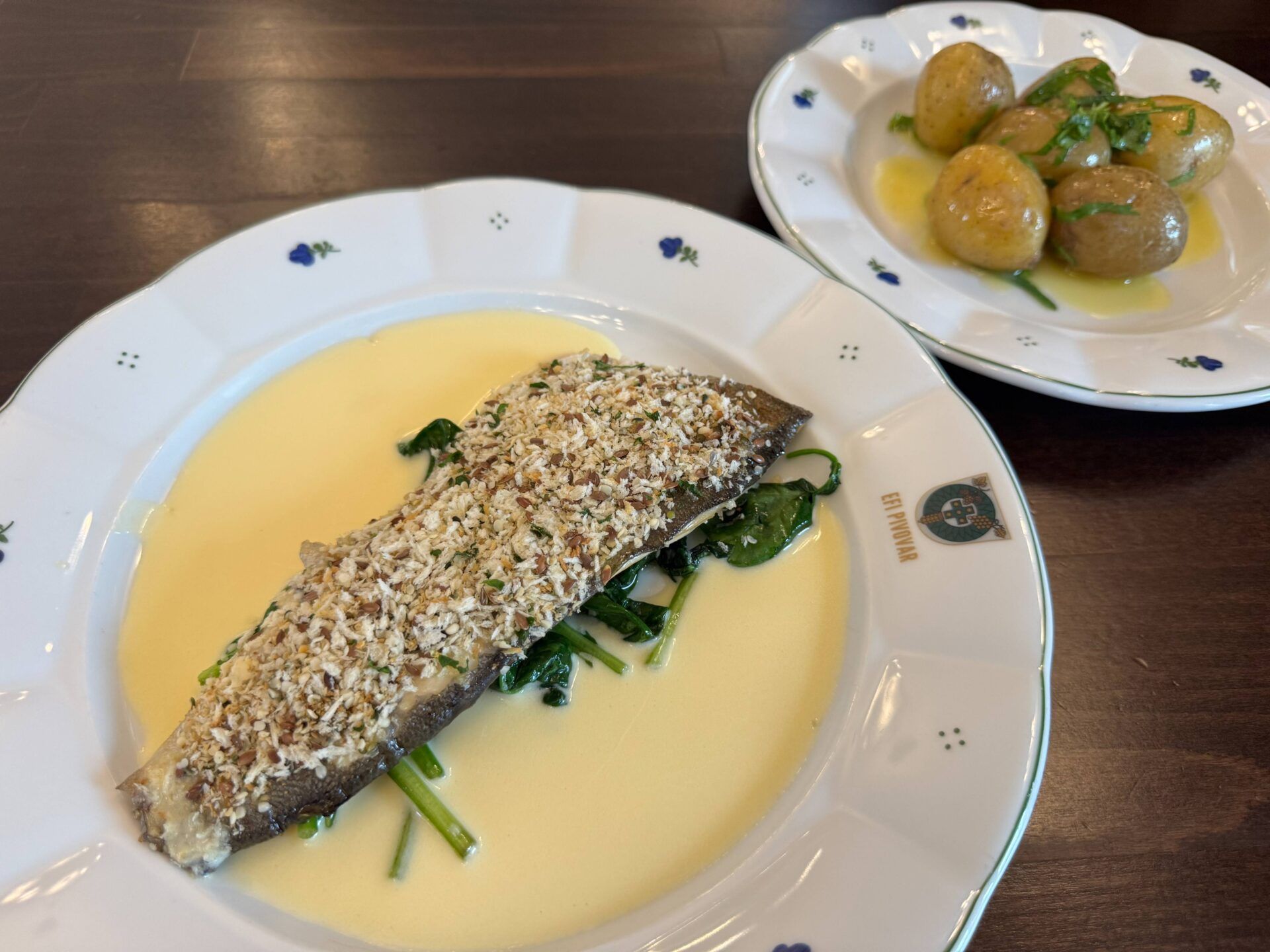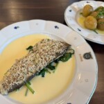 • Zauzené filety ze pstruha s bylinkovou krustou s baby špenátem, omáčkou z másla a ryzlinku a jarními bramborami