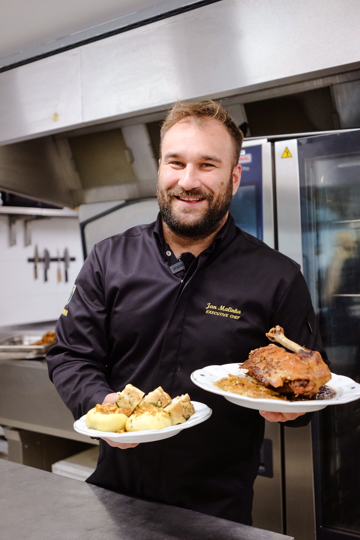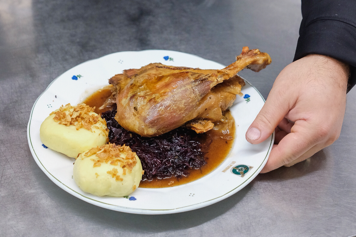 - Hlavní chod: pečená svatomartinská husa se dvěma druhy zelí (červené kysané a bílé s ryzlinkem), k tomu bramborový a špekový knedlík a silná husí omáčka.