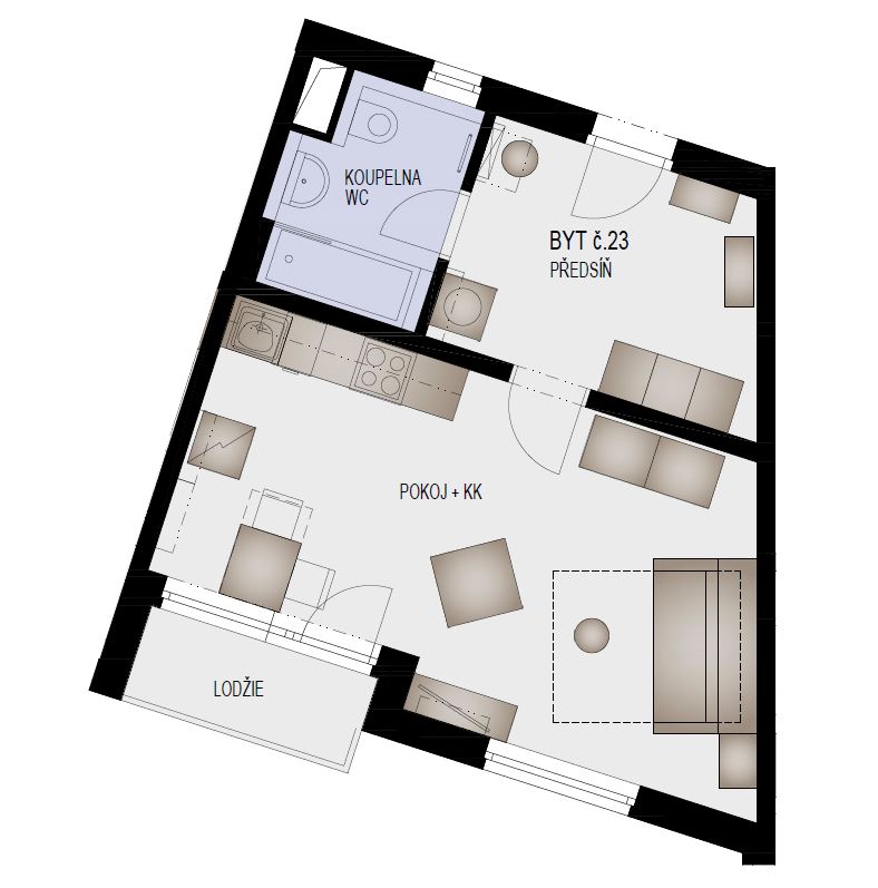 Dispozice: 1+kk, 38,9 m2 + lodžie 2,7 m2 + sklep 2,3 m2