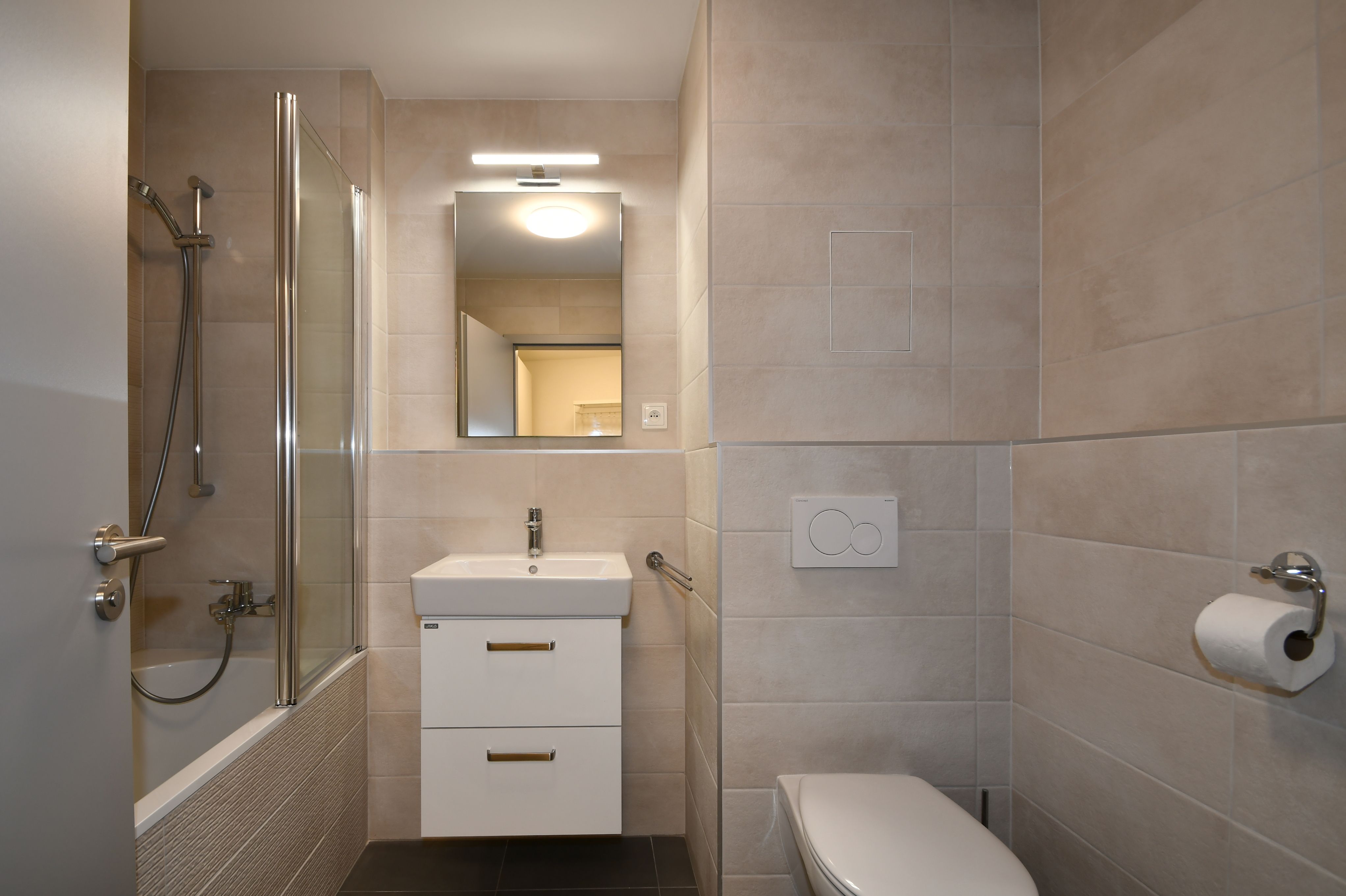 Koupelna (4,7 m2) je vybavena vanou, umyvadlem a WC. V prostorné předsíni (8,8 m2) je umístěn dveřní videotelefon a přípojka na pračku.