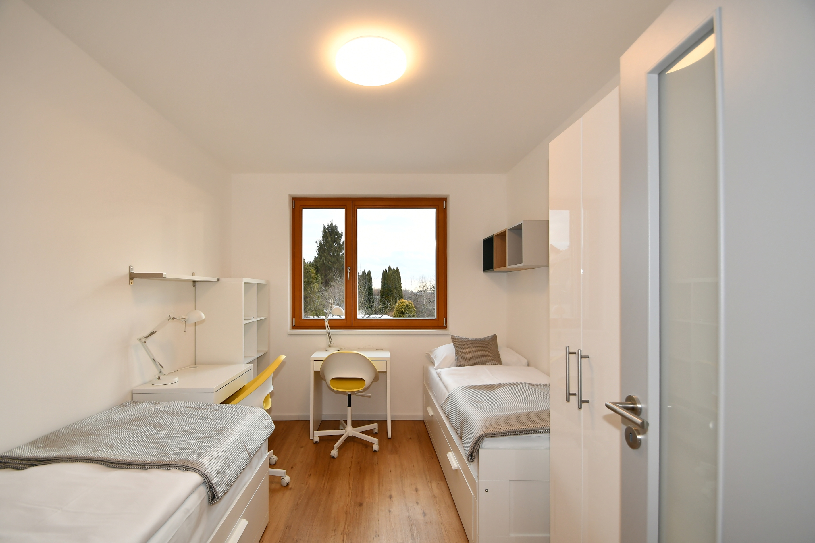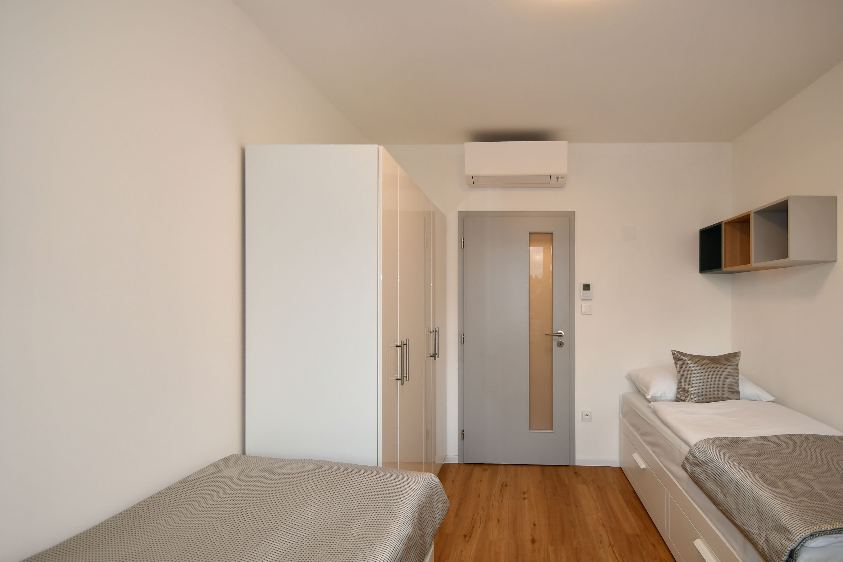 Další dva pokoje (13,3 m2 a 11,2 m2) mají samostatné vstupy a jsou orientovány do klidné dvorní části domu. Předsíň (6,2 m2) je vybavena dveřním videotelefonem. K dispozici je samostatné WC (4,1 m2) a chodba (4,7 m2). Koupelna (6,3 m2) nabízí umyvadlo, vanu, sprchový kout a přípojku na pračku.