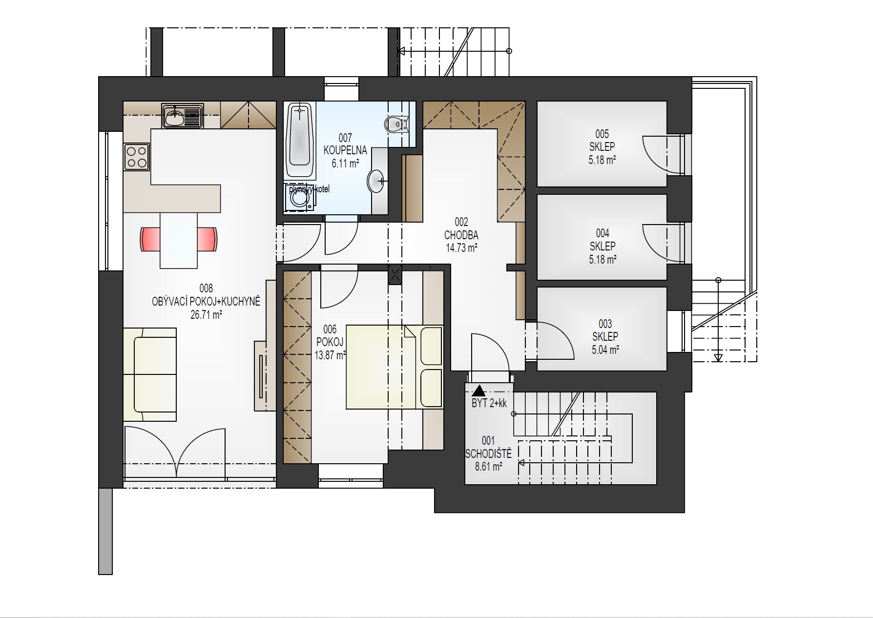 2.NP byt 3+kk: celková výměra bytu 86,94 m2, pokoj 12,40 m2, pokoj 11,75 m2, kuchyně s obývacím pokojem 35,84 m2, předsíň 8,17 m2, koupelna s vanou 4,21 m2, samostatné WC 1,57 m2, komora 2,15 m2, balkon 5,67 m2. K bytu náleží zahrada o celkové výměře 170 m2, sklep 5,18 m2 a parkovací místo před domem o výměře 14 m2.