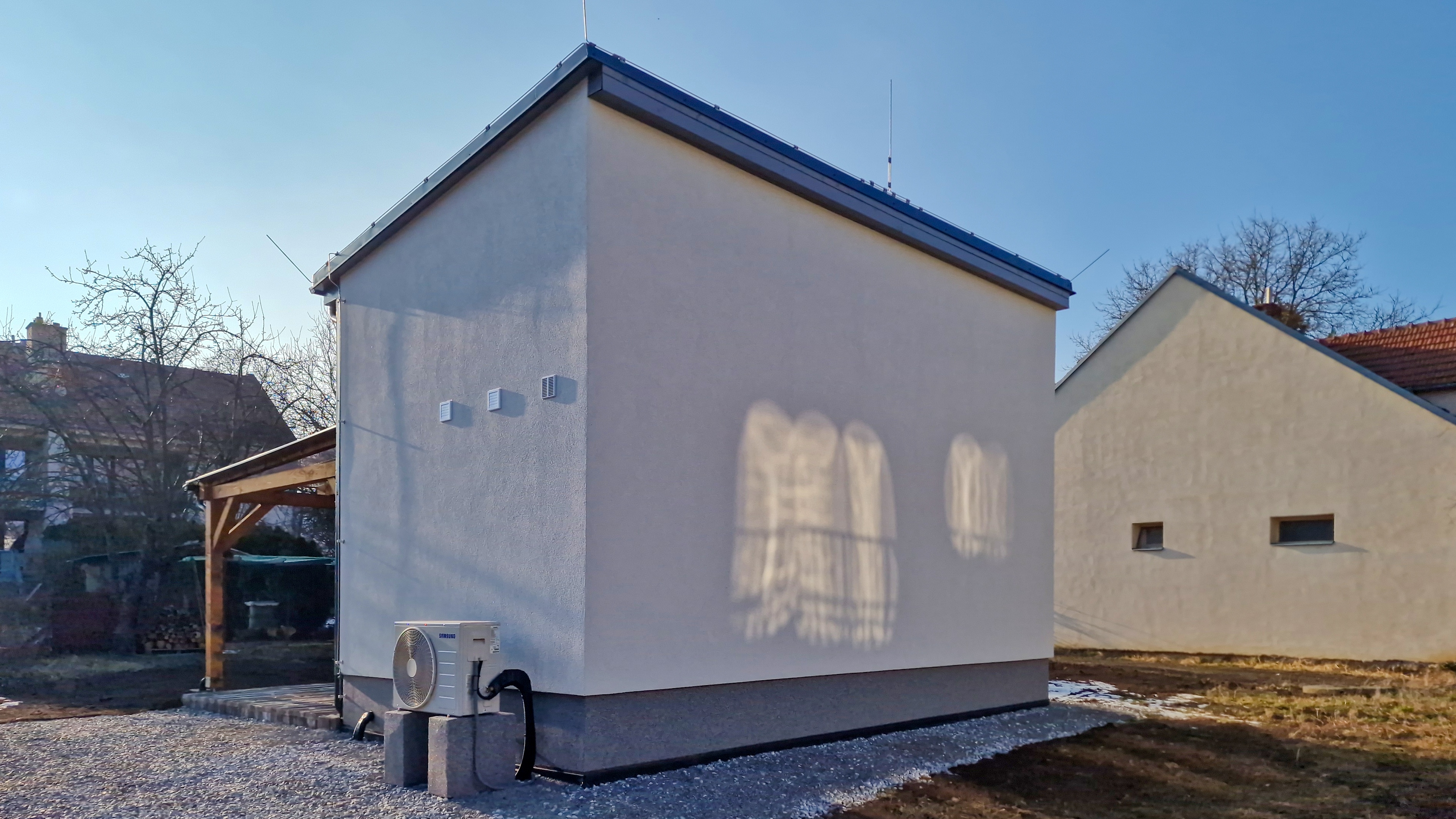 Součástí prodeje ji i novostavba menšího samostatně stojícího domku s krytou terasou o zastavěné ploše 25 m2 v zadní části pozemku. Domek je jakou součást hlavní stavby. Dům je vybaven tepelným čerpadlem pro vytápění a ohřev vody, koupelnou se sprchovým koutem, WC a umyvadlem. Kuchyňská linka včetně spotřebičů. Spaní je řešeno v podkrovní části domku s dřevěnou vestavěnou palandou.