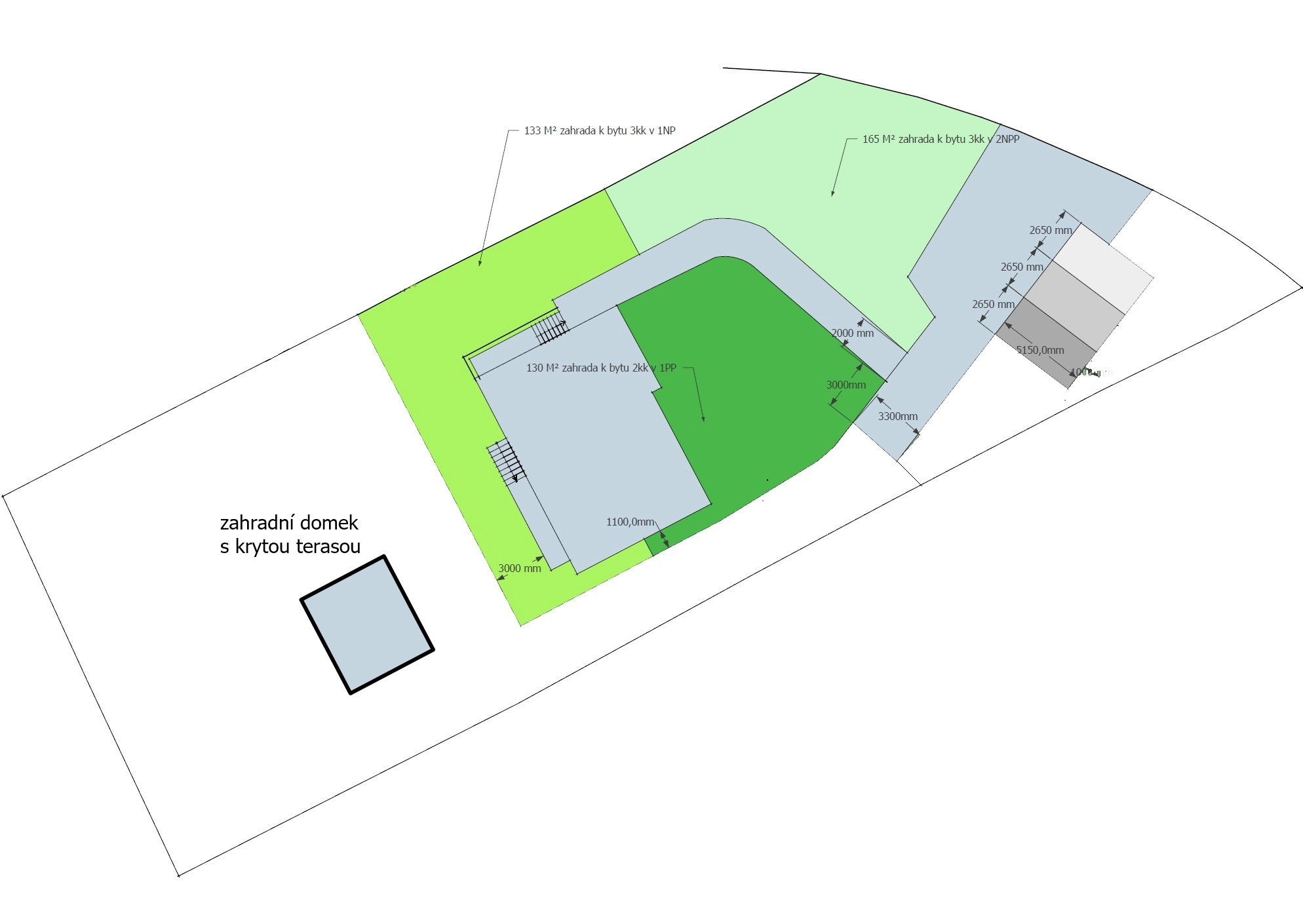 Všechny tři byty včetně zahradního domku, jsou momentálně pronajaty na základě nájemní smlouvy za tržní nájemné na dobu určitou. Výše čistého nájmu z pronájmu všech tří bytů a domku je 964.620 Kč ročně.Bytový dům: 1.PP byt 2+kk: celková výměra bytu 66,46 m2, pokoj 13,87 m2, kuchyně s obývacím pokojem 26,71 m2, předsíň 14,73 m2, koupelna s vanou a WC 6,11 m2, šatna 5,04 m2. K bytu náleží zahrada o celkové výměře 152 m2 a parkovací místo před domem o výměře 14 m2.