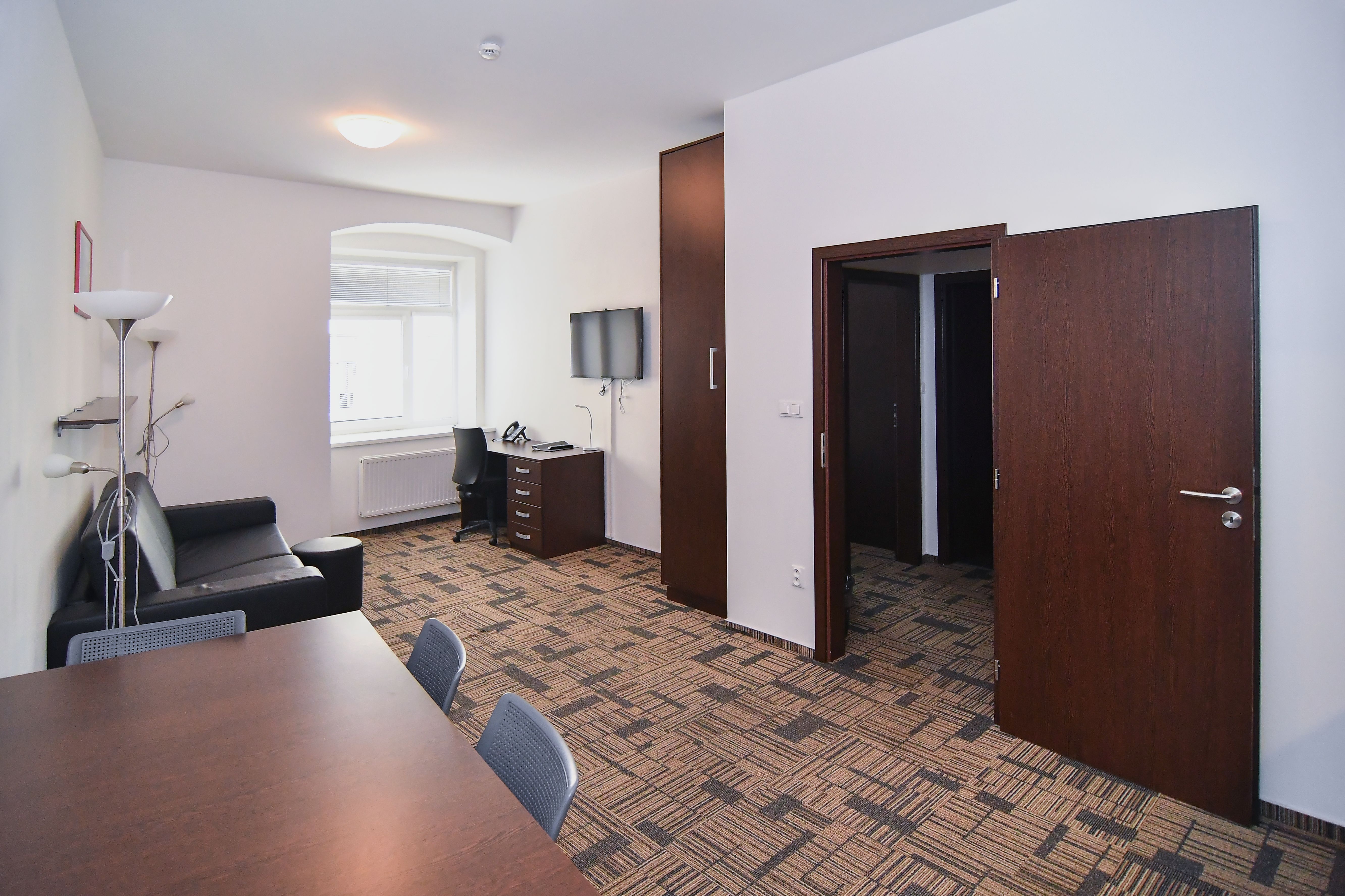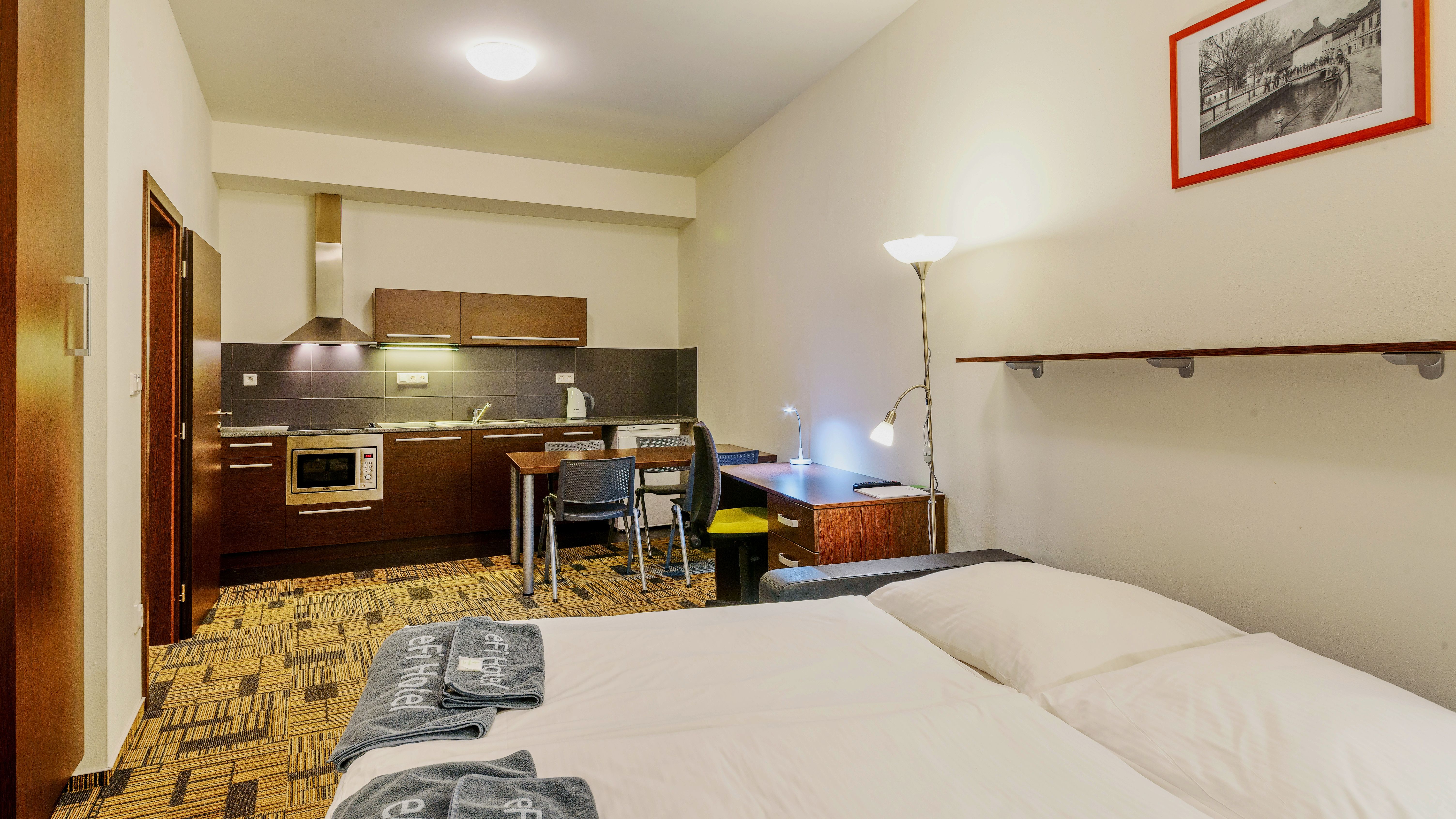 Celková výměra bytu je 45,1 m2. Předsíně 3,2 m2, koupelna 4,3 m2, pokoj s kuchyňským koutem 23,47 m2. Ložnice se samostatným vstupem z předsíně je o výměře 14,12 m2. Okna jsou situovány na severní stranu do ulice Bratislavská.
