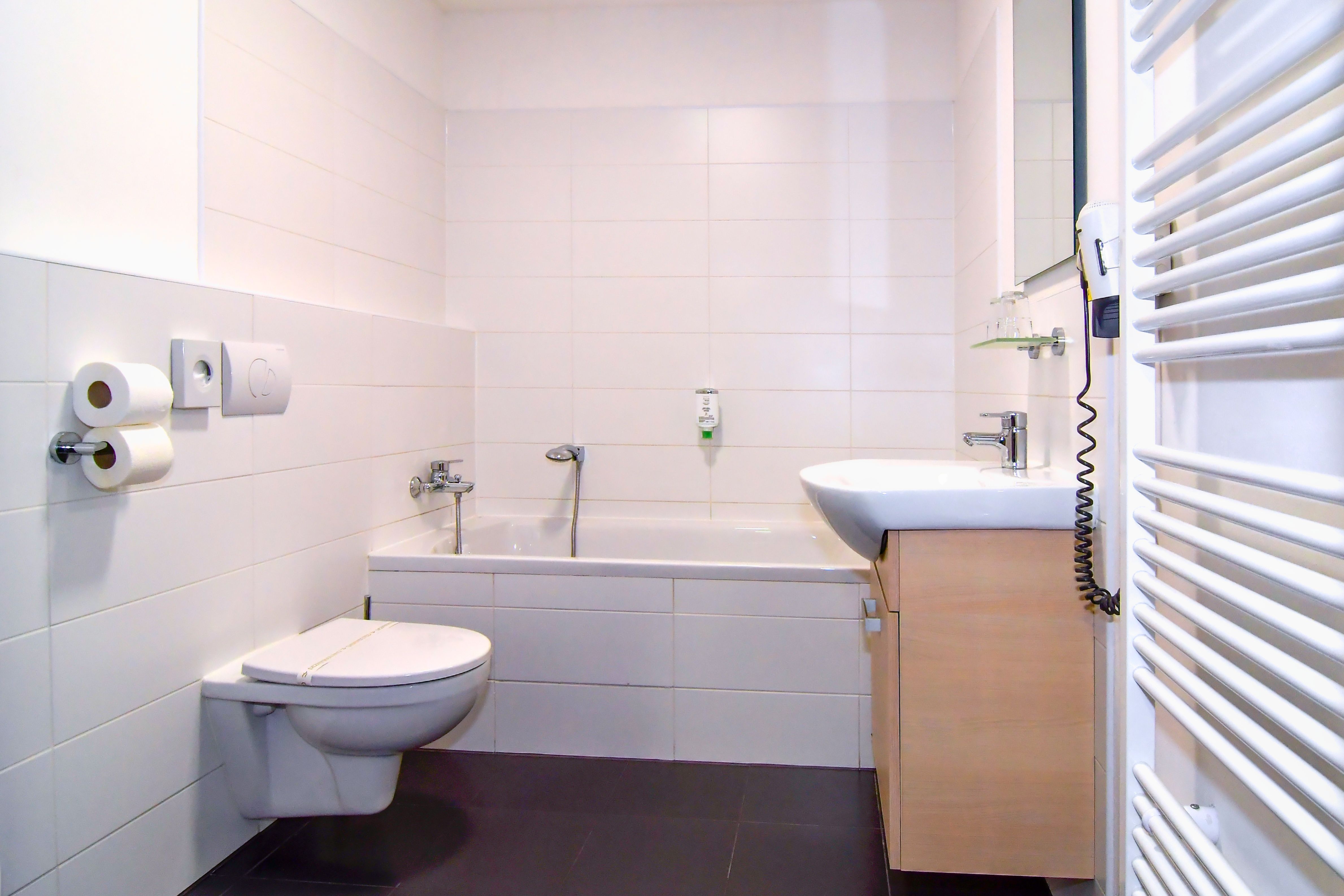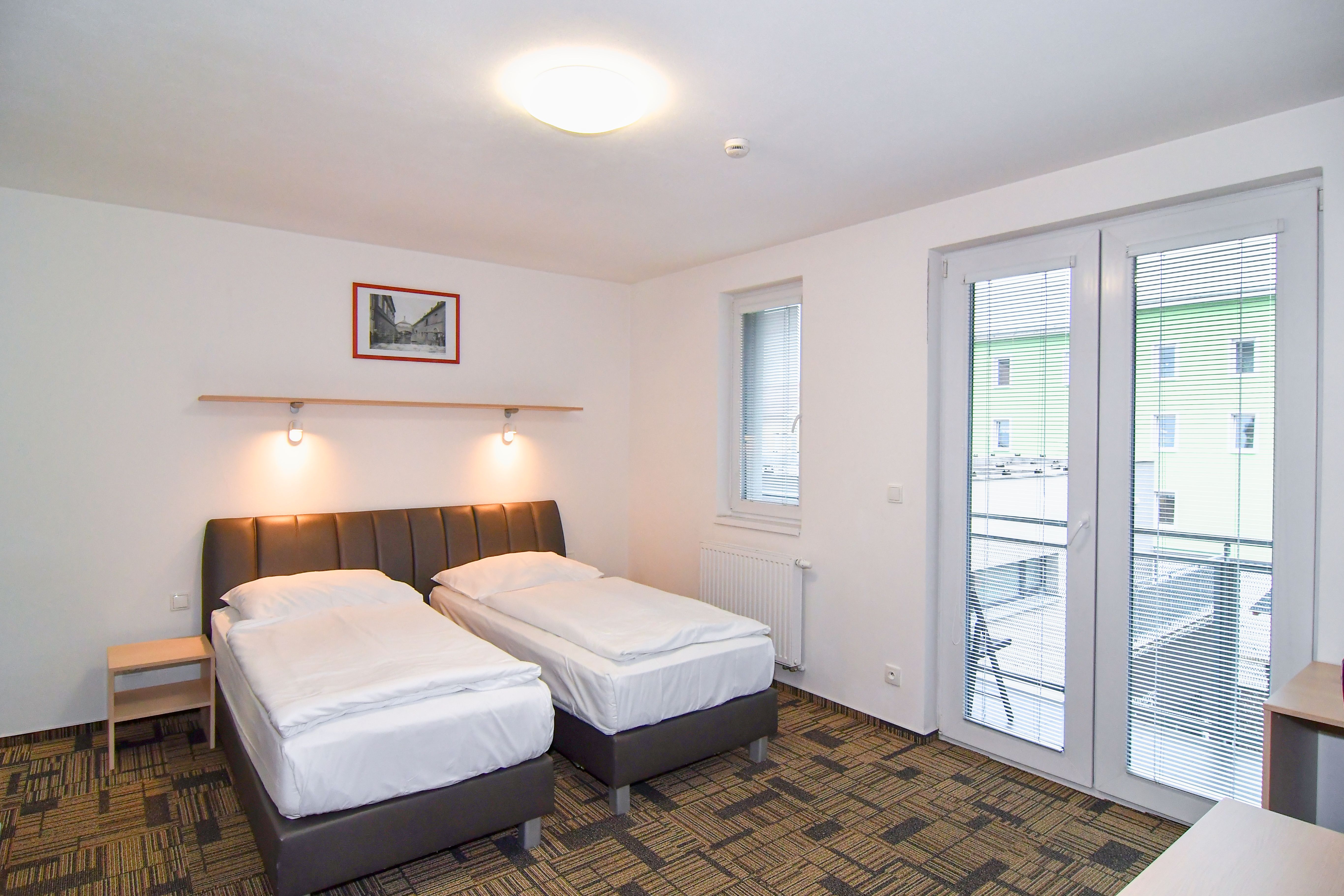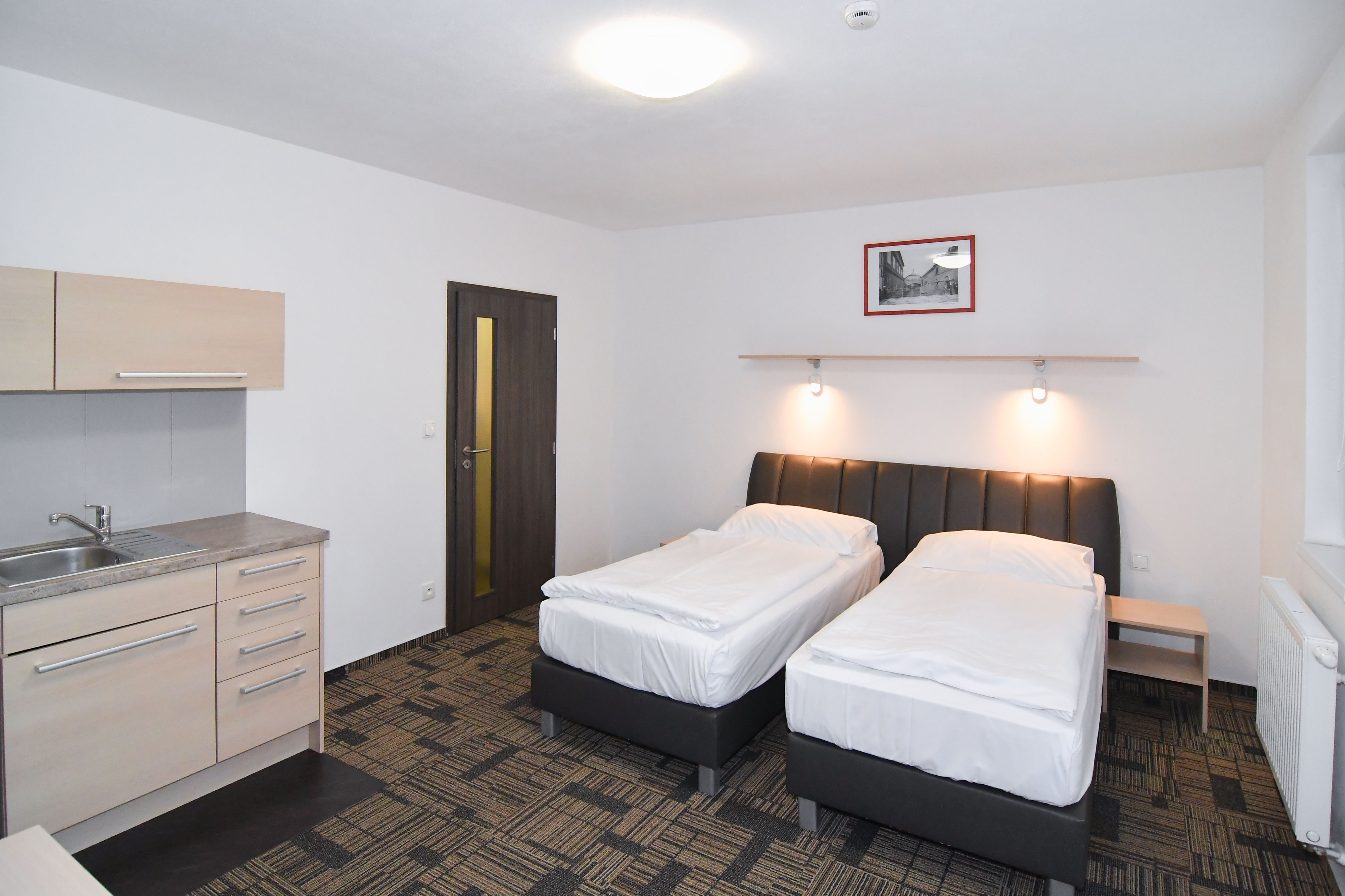Byty 1+kk jsou o výměře od 33,14 do 47,25 m2 a nacházejí se ve 2.-5. podlaží. Byty jsou vybaveny klimatizačními jednotkami zn. Samsung, včetně dálkového ovládání. Budova je opatřena výtahem i schodištěm. Byt má vstupní chodbu vybavenou vestavěnou šatní skříní s celoplošným zrcadlem a pokojovým trezorem. Dále byt disponuje vlastní klimatizací, moderní vybavenou kuchyňskou linkou s pracovní deskou, podstavnou lednicí indesit, vestavěnou mikrovlnou trouba s grilem a horkovzdušnou troubou, varnou konvicí a jídelní soupravou s nádobím pro 2 osoby. Pokoj je vybavený jídelním stolem se 2 židlemi, pracovním stolem s kancelářskou židlí a smart TV. V pokoji je luxusní postel King Koil s možností uspořádání postelí odděleně nebo jako manželská postel. Koupelna může být s vanou nebo sprchovým koutem, umyvadlem, wc a topným žebříkem. Z pokoje je vstup na balkon orientovaný do vnitrobloku. WiFi připojení se standardní rychlostí dat je již v ceně pronájmu.